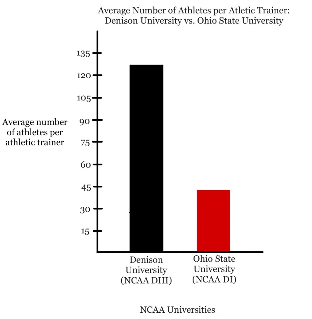 In order to understand the severity of the gap, I compared the number of athletic trainers at Denison University with those at The Ohio State University. Denison currently has five full-time trainers covering 629 athletes across nearly 30 varsity teams. At Ohio State, there are twenty-one trainers for 859 athletes. This means that, on average, each Denison trainer is responsible for about 126 athletes, while each Ohio State trainer is responsible for about 41 athletes.