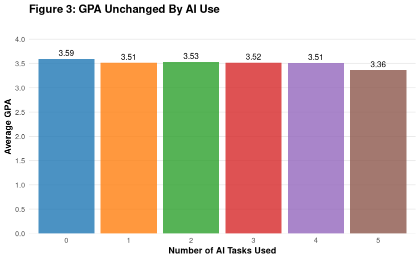 Similar to Figure 2, the lack of change could be simply because AI is completely ineffective, but it is more likely because it is enabling students to get a higher GPA (or spend less time on homework) than they otherwise would. Students that would traditionally spend more time on homework or get lower grades can use AI to catch up to the other students. Currently, AI is not this magic tool that guarantees no time spent on homework and a perfect GPA. Instead, it is allowing the majority of students to achieve almost identical academic results.