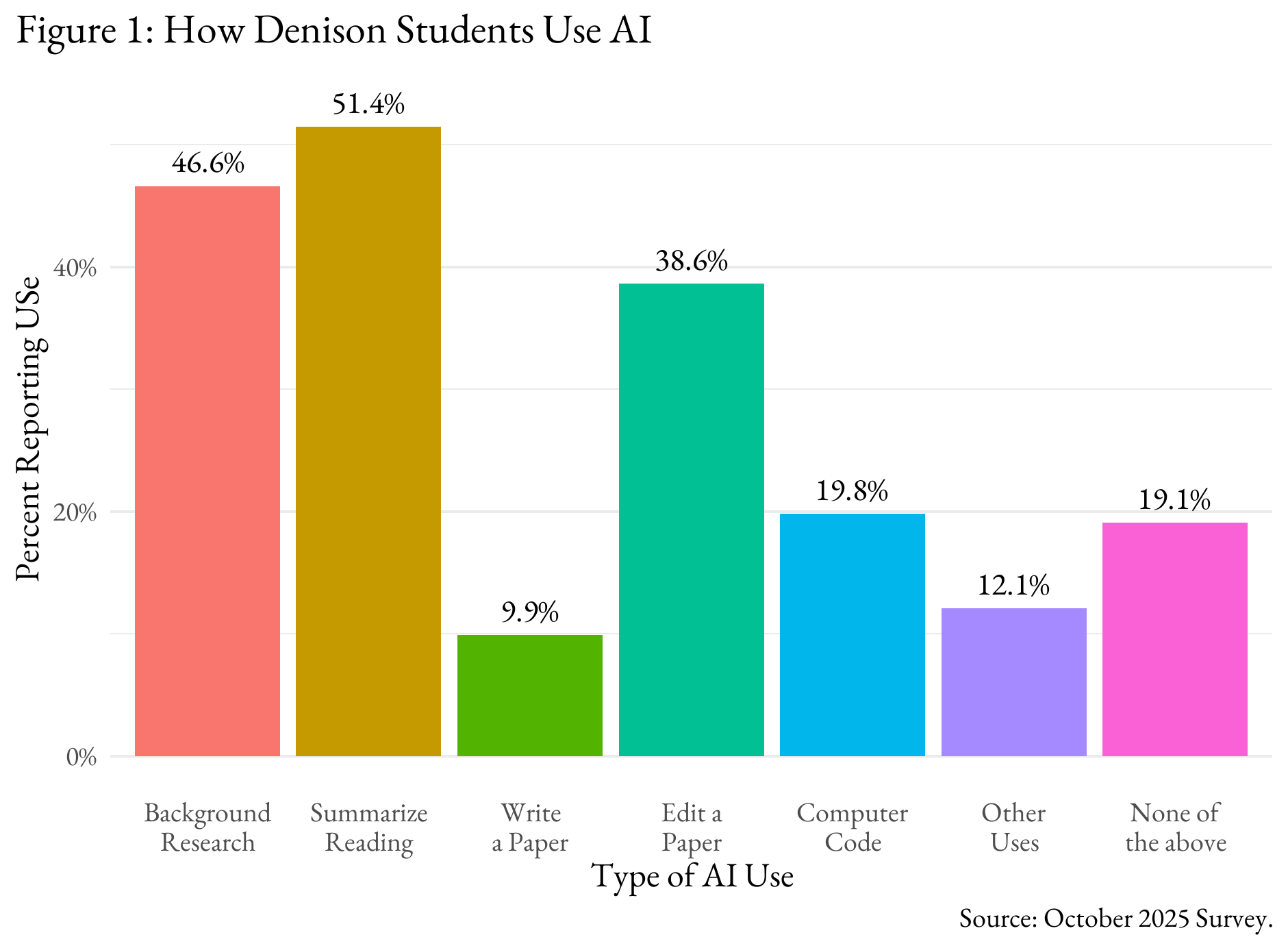 AI can be used for a range of tasks, from small things like editing a paper to writing an entire paper. Below, Figure 1 shows the percent of students at Denison that use AI for several different types of tasks. The most popular use, with half of the student population using it, is summarizing readings, and close behind is background research. This suggests that AI is primarily being used as a study aid to manage homework as opposed to entirely replacing it. That being said, almost 10% of students admit to having AI write the entirety of their papers. This last stat is no different from previous semesters (Spring 2024 and Fall 2024), but the rest show considerable increases.