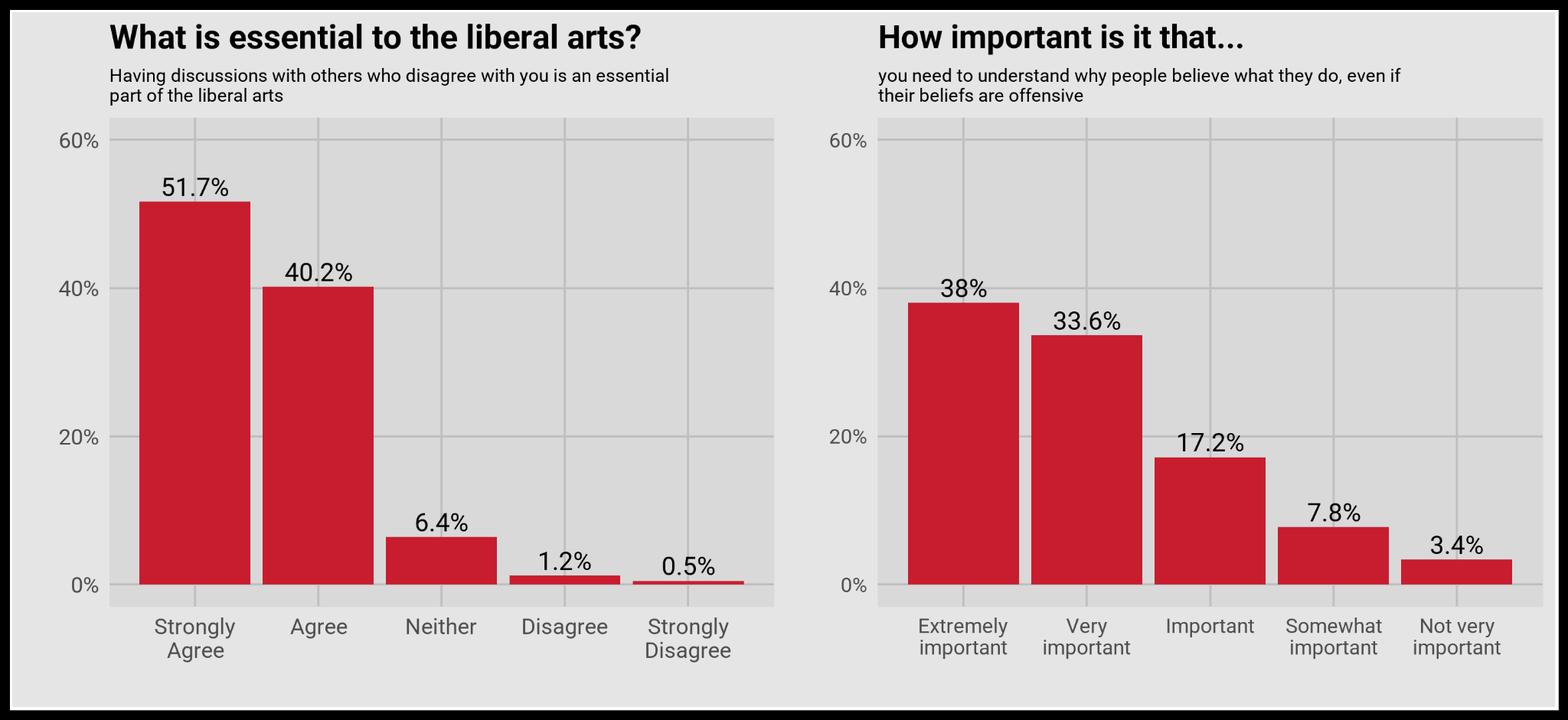 Denison’s mission statement includes a particularly emphatic assertion: “Our purpose is to inspire and educate our students to become autonomous thinkers, discerning moral agents, and active citizens of a democratic society.” The upside is that Denison students hew to this mission. As shown in the figures below, an overwhelming majority of Denison students think that having discussions across disagreement is vital to the liberal arts experience. A similar majority feel it necessary to understand why people believe what they do, regardless of how inflammatory or damaging the beliefs are.