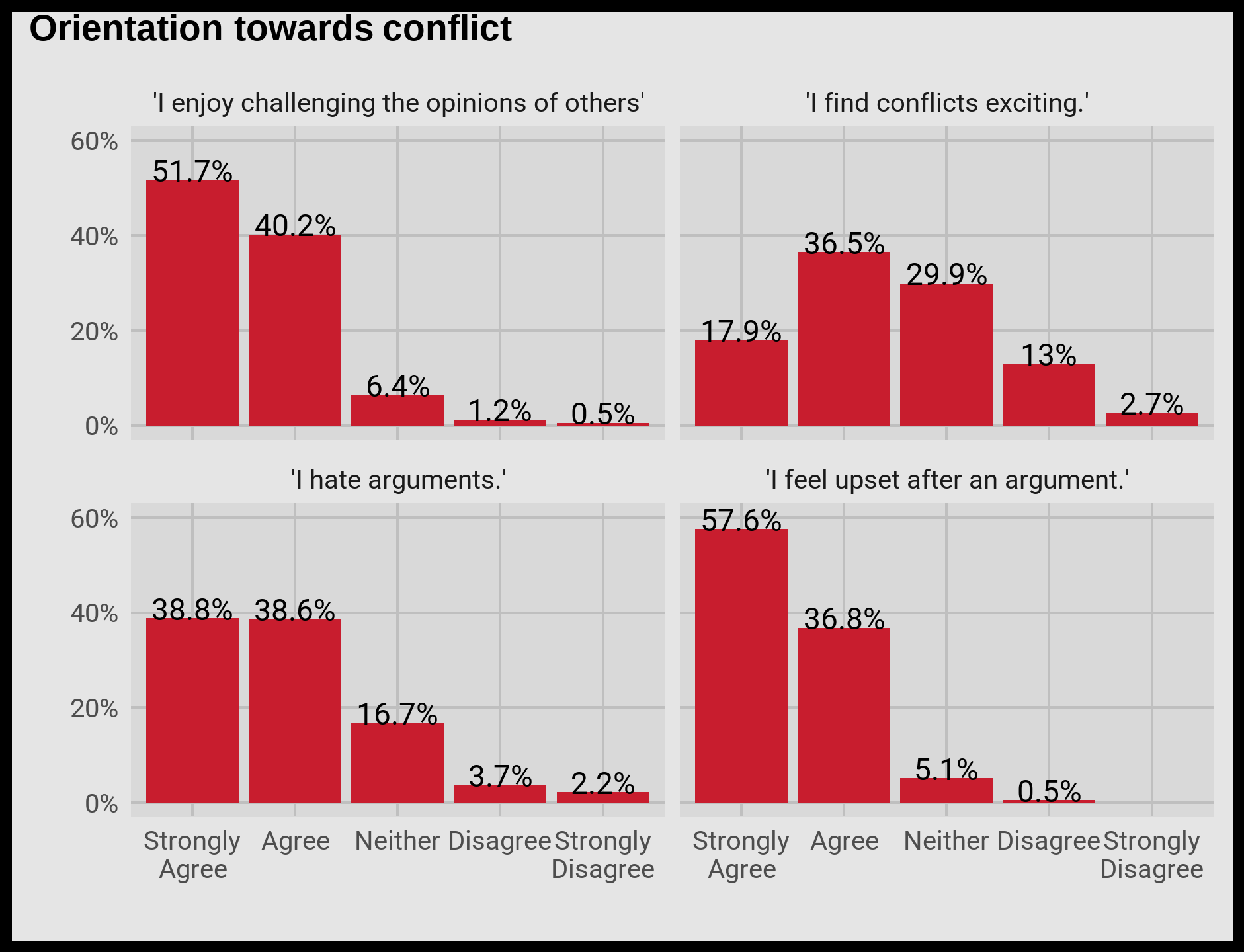 Over 60% of students surveyed said that they enjoyed challenging the opinions of others. However, the majority of students also responded that they feel upset after arguments, and 45% of students even said they hated arguments. So, is challenging others more of an effort to signal virtues than anything else?
