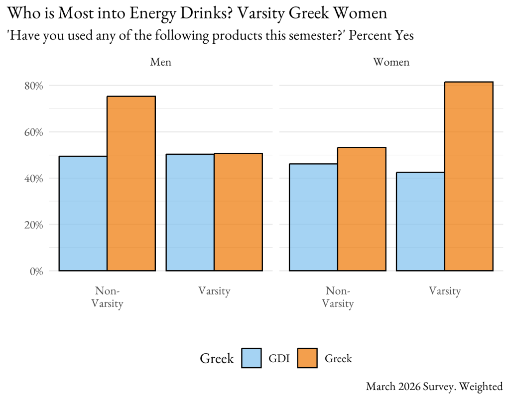 Energy drink consumption is not exclusive to the women’s soccer team. In February of 2024, the NCAA reported that 44% of college athletes consumed energy drinks. At Denison, athletes can purchase energy drinks from the vending machine in the lobby of Mitchell Athletic Center on their way to practices and games. And many do, as the following figure shows – over 80 percent of Greek women varsity athletes use energy drinks.