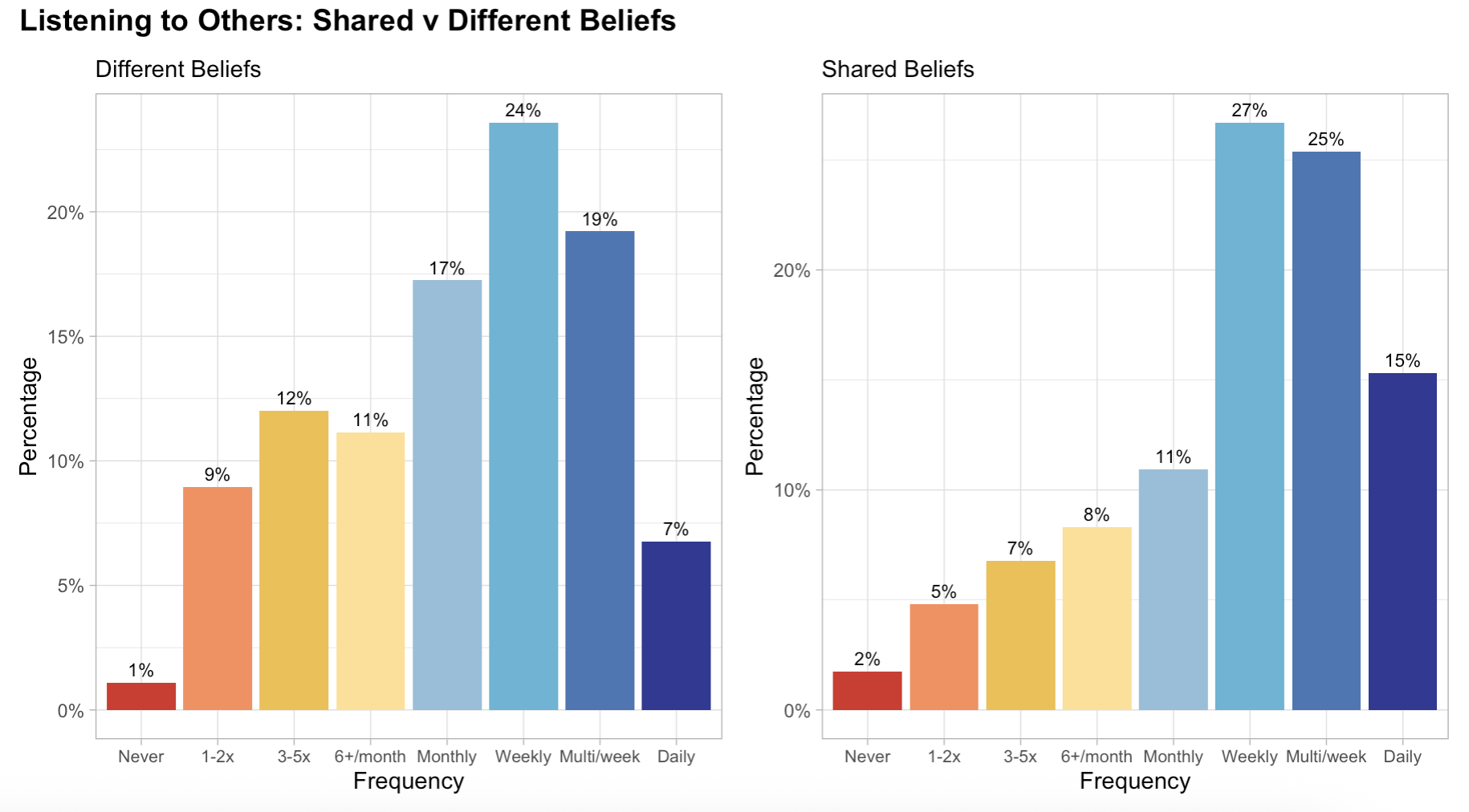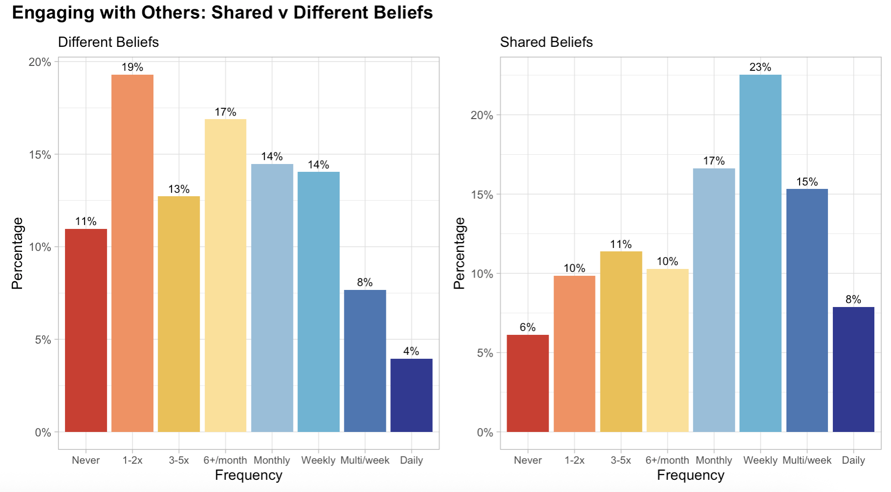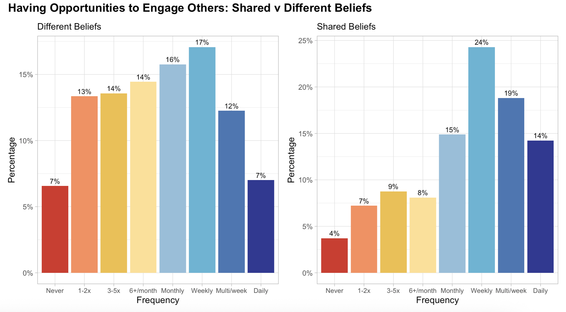 Well, as shown in the figures below, students identified that the opportunities to engage were less common with groups of people they disagreed with. 57% of students said they had opportunities to engage weekly+ when there were shared beliefs, as opposed to 36% when there were different beliefs.