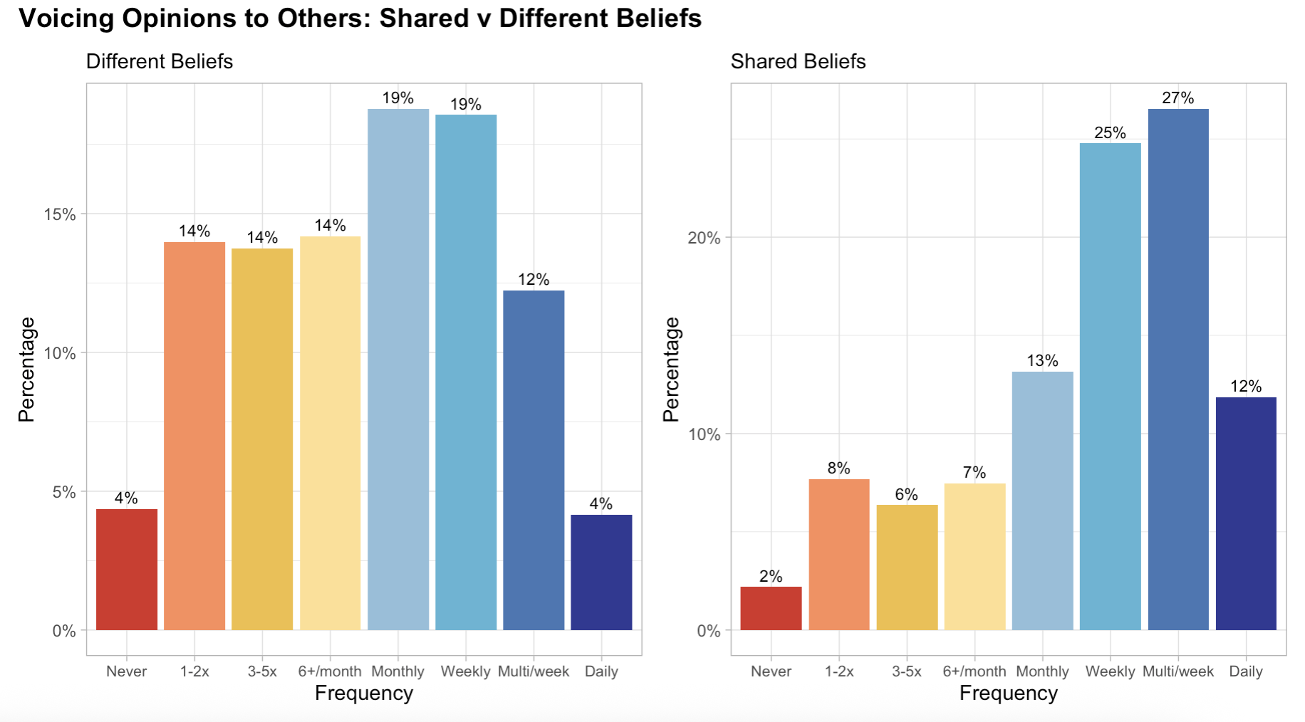 A more striking version of this separation appears when you look at the visualizations showing rates of expressing opinions to people who agree/disagree with a student’s beliefs. Students were far more averse to expressing their beliefs when it came to talking with peers with diverse attitudes. The share of students voicing opinions daily jumped from 4% to 12% between different and similar beliefs and weekly or more from 35 to 64% – almost doubling. For students who shared opinions less than monthly, the share dropped from 46% to 23%.